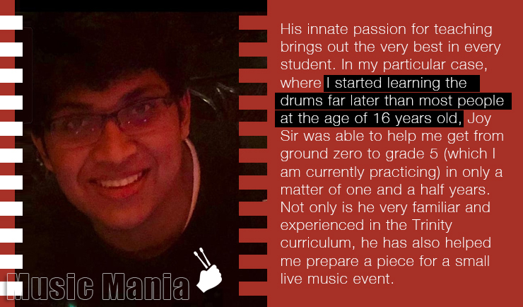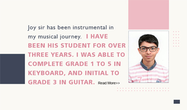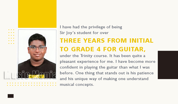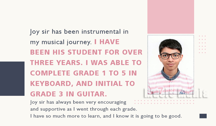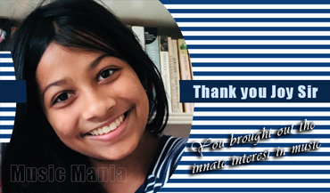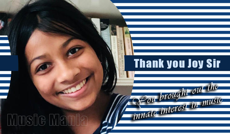 Joy sir brought out the innate interest in music for my daughter Diya. He understands each student, adapts and teaches according to their style of learning. Patient and always smiling, he lives up to his name and brings positive vibes into the house when he comes for classes.